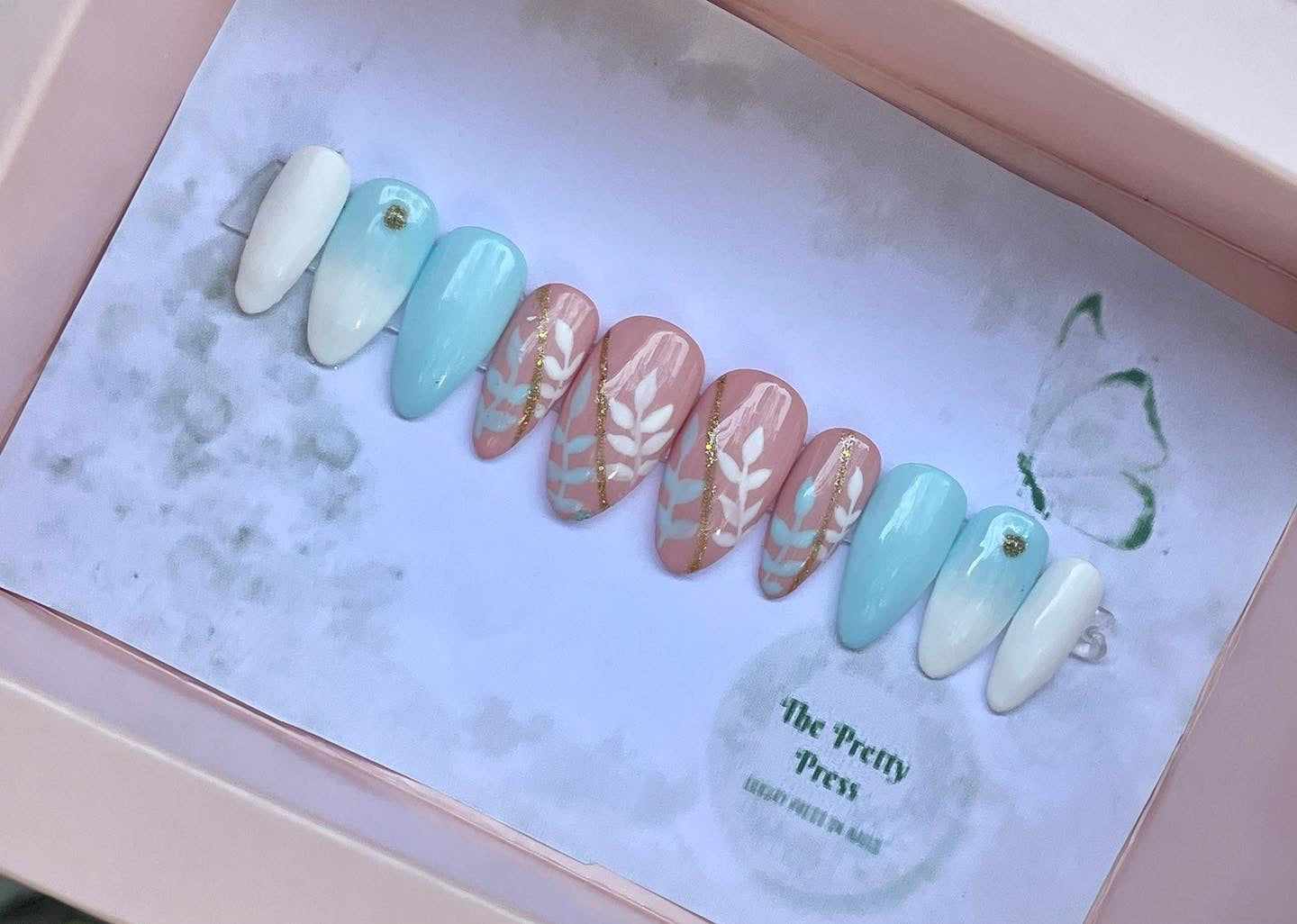 The box includes glue, nail file, manicure stick and an instruction card along with Nails.