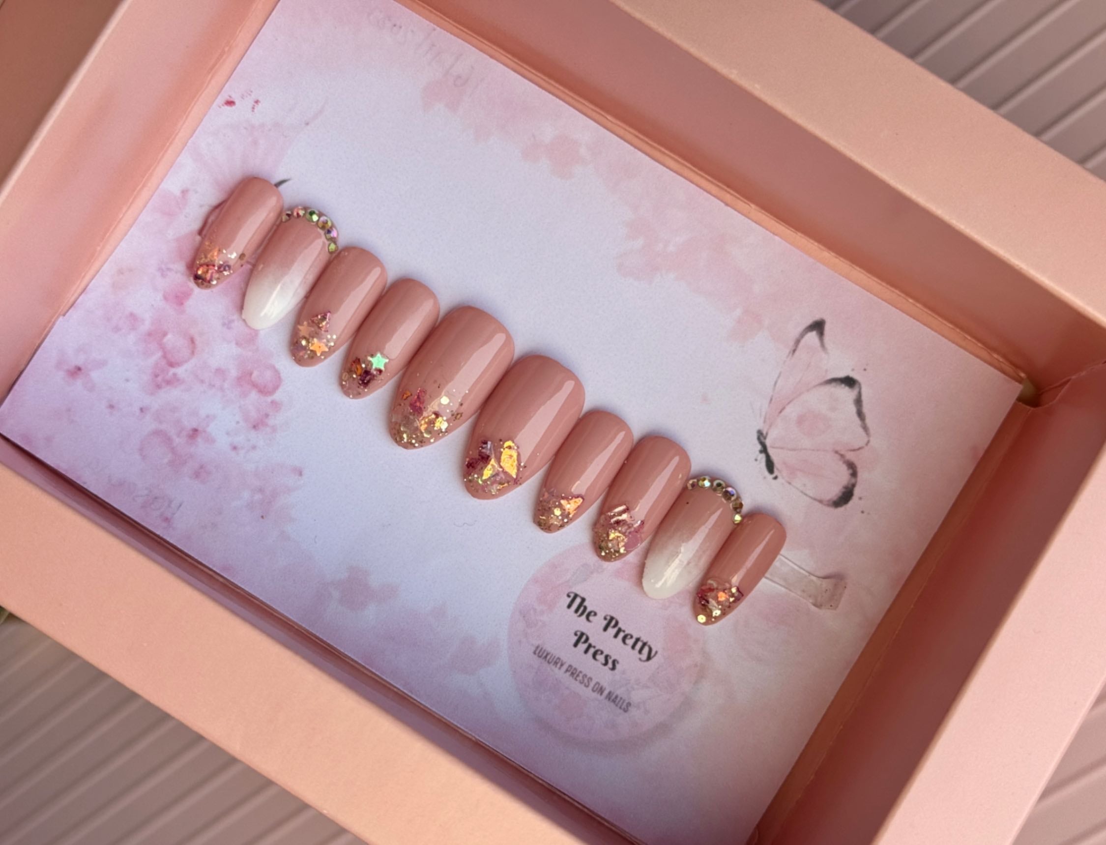 The box includes glue, nail file, manicure stick and an instruction card along with Nails.